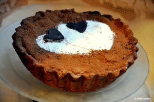 Çikolata sosu donduktan sonra, eğer arzu edersek üzerini çeşitli şekillerde süsleyebiliriz. Ancak sadece kakao serpeleyerek de süslemek mümkündür.