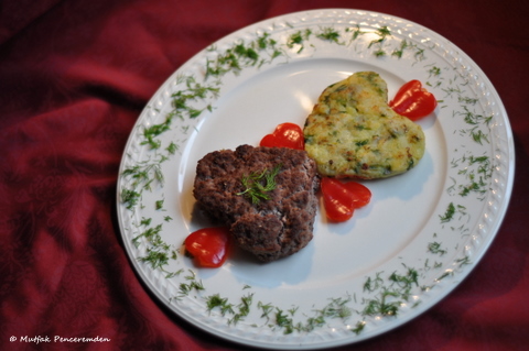 Köftemizi en büyük kalp şeklindeki kalıbımızla ( 10-cm.çap) kesip tabağa alıyoruz. Yukarıdaki miktar köfte hamurundan 4 adet büyük kalp elde ettikten sonra kenarlardan kalan köfteleri yeni bir yemekte mesela bir çorbada değerlendirebilirsiniz.