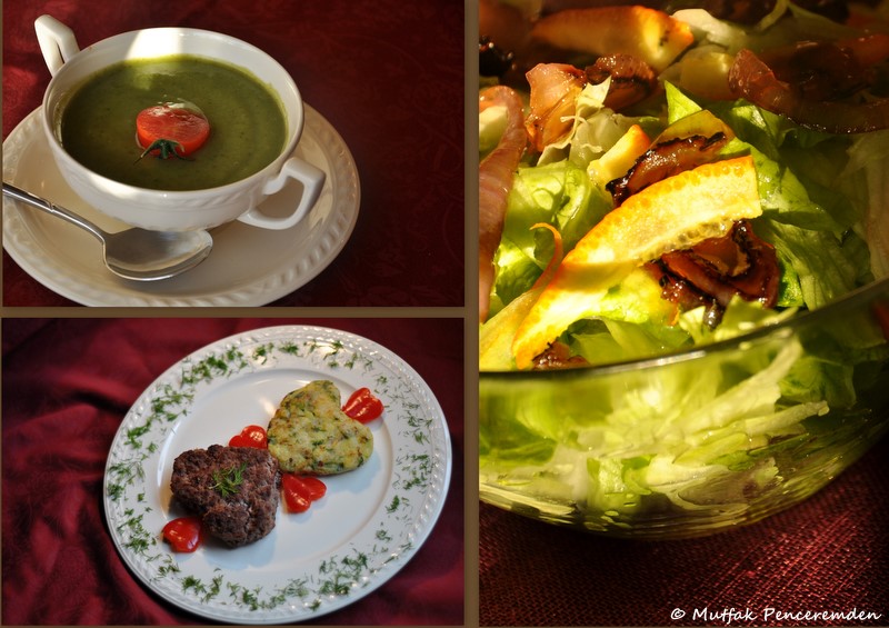 Bugün sizinle paylaşacağım ilk menü: Brokoli Çorbası, Karamelize Soğanlı Salata, Kalp Köfte ve Patates, Kestaneli Muffin