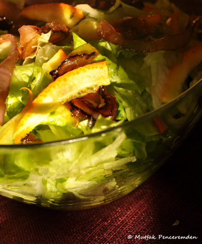 Bir kase karışık yeşillik salatası hazırlıyoruz. Salatayı ve portakal kabuklarını, hazırladığımız sos ile iyice karıştırıyoruz. Üzerine karamelize edilmiş ve kurutulmuş soğan halkalarını koyup tekrar karıştırıyoruz.