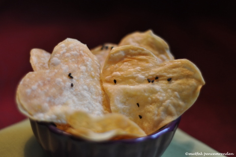 Bir yufkayı tezgaha yayıyoruz. Üzerine çırpılmış 1 yumurtanın akı ve sıvı yağ karışımını fırça yardımıyla sürdükten sonra ikinci kat yufkayı üzerine kapatıyoruz. 5 Dakika kadar bekledikten sonra yufkamızdan kalıplarımızı kullanarak kalp şekillerini çıkartıyor ve yağlı kağıt yayılmış bir tepsiye diziyoruz. Fırına vermeden önce arzuya göre üzerlerine yumurtalı karışımdan çok az sürüp çörekotu veya kaşar rendesi serpiyoruz. Yufkalar pembeleşene kadar yaklaşık 5-10 dakika, max.150◦c de pişiriyoruz.