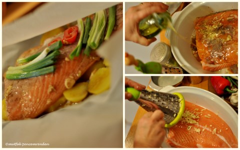 Arzu ederseniz balığı fotoğrafta görüldüğü gibi bütün olarak tek bir kağıtta da pişirebilirsiniz.