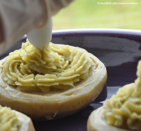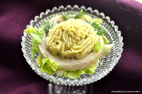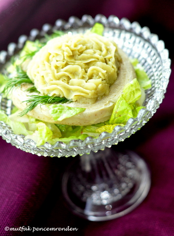 Enginarlarımızı biraz ılındıktan sonra üzerinde marul yaprakları olan servis tabaklarına alıyoruz. Göbeklerine fotoğrafta da görüldüğü gibi bez torba yardımıyla fava sıkarak süslüyoruz. Bir miktar dereotu serpeliyoruz.
