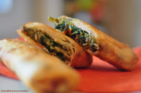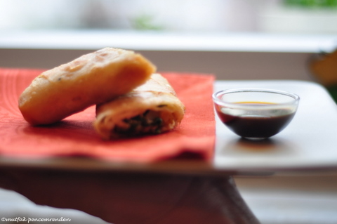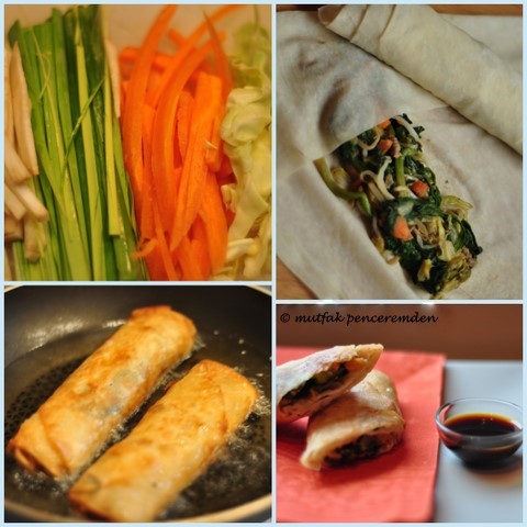 Bütün sebzeler sırasıyla iyice yıkandıktan sonra süzülmeye bırakılır. Bu böreğin yapılışındaki en önemli püf noktası sebzelerin kesilmesidir. Bütün sebzeler ıspanak ve soya filizi hariç, fotoğrafta da görüldüğü gibi” jülyen” yani boylamasına ince uzun olarak kesilmelidir. Sebzelerimiz kesildikten sonra derince bir tencereye biraz sıvı yağ koyuyor ve sırasıyla önce lahanadan başlayarak hafifçe döndürmeye başlıyoruz. Lahana yumuşamaya başlayınca havuçları ardından pırasayı, sonra kerevizi, kıymayı ve en son da ıspanak ve soya filizini katıyoruz. Böylece sebzeler pişme özelliklerine göre tencereye katılmış oluyor. Ispanak ve soya filizini kattıktan 5 dakika sonra tenceremizin altını söndürüp tuz*, karabiber, ve bir çorba kaşığı soya sosu ekliyoruz. (Soya sosu kendisi tuzlu olduğu için burada koyacağımız tuza çok dikkat etmek gerekir. Hatta belki de hiç tuz koymayabilirsiniz.)Tenceredeki bu içi iyice harmanlayıp büyükçe bir süzgece alıp süzülmesi için bırakıyoruz. Bu arada yufkalarımızı dörde bölerek toplam 12 parça elde ediyoruz. Soğumuş ve iyice süzülmüş börek içimizi de göz kararı 12 ye bölerek yufkalara yerleştiriyor ve böreklerimiz fotoğraflarda görüldüğü gibi sarıyoruz. Yufkanın en ucuna bir parça yumurta akı sürerseniz böreğiniz kızarırken açılıp dağılmaz! İster hemen, ister derin dondurucu da sakladıktan sonra böreklerimizi kızartarak yanında soya sosu ile beraber servis yapıyoruz.