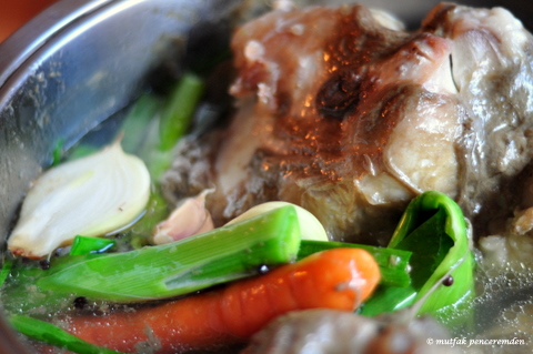 Kemik ve etleri iyice yıkadıktan sonra en az 6 saat kadar tuzlu suda kanlarının çıkması için bekletiyoruz. 1 adet iyice yıkanmış bütün soğan ve sarmısağı,havuç,tane karabiber ve pırasa yeşilini ilave ediyoruz. Üzerini örtecek kadar su yaklaşık 3-4 lt.koyduktan sonra kaynatmaya başlıyoruz ve sık sık üzerinde oluşan köpüğü alıyoruz. Bu işlem çok önemlidir, kesinlikle atlanmamalıdır. Suyu azalırsa biraz kaynar su ekliyoruz. Kemiklerin içindeki ilikler eriyinceye kadar yani yaklaşık 4-5saat kaynatıyoruz.Ardından kemikleri suyun içinden alıyoruz. Üzerlerinde hiç et ve ilik kalmayıncaya kadar ayıklıyoruz. Kemikleri çöpe, üzerlerinden çıkan ilik ve et parçalarını tenceremize geri koyuyoruz. Tenceremizi bu şekliyle serin bir yerde beklemeye alıyoruz.