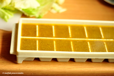 Geride kalan jölemsi et suyu artık saklanmaya hazırdır. Plastik buz kalıplarında dondurup saklıyoruz.
