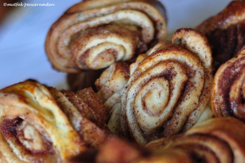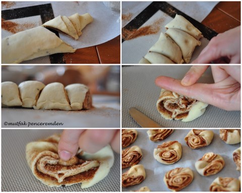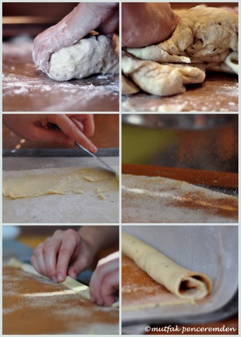 Şimdi hamuru elinize alın ve biraz da elinizde az bir unla yoğurun. Hamurun ¾’ünü alıp büyük bir dikdörtgen şeklinde çevire çevire açmaya başlıyoruz. Büyük bir tezgâh ve masada çalışmanızda fayda var he bu arada az sonra her taraf toz şeker ve tarçın tozu olacak, o yüzden iyisi mi siz temizliği sonraya bırakın : ) Tam bu sırada yani hamuru açmaya başlarken tezgâhın üzerine çok miktarda un serpeleyin ya da büyükçe bir naylon yayın, bu naylon hamuru kıvırırken yardımcı olacaktır.