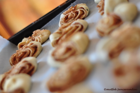 25 dk’nın geçmesini beklerken geri kalan hamuru ne yapsam diye düşünebilirsiniz. İsterseniz aynı şekilde bir önceki tariften devam edebilir isterseniz de başka bir şey deneyip hamura kuru üzüm, yaban mersini, kesilmiş kuru kayısı vb.lerden birini katıp yine yağ ve şekerle tarçın sevmeyenler için bir alternatif yaratabilirsiniz…