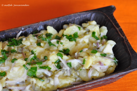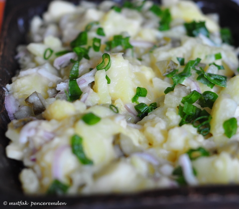 Güney Almanya’ da bu patates salatasına Schwaebische Kartoffelsalat denir ve içine muhakkak ½ bardak kadar ılık et suyu katılır. Bu, yöresel bir özellik olup, patates salatasına muhteşem bir lezzet katar. Et suyu deyince daha önce tarifini verdiğim, yağı tamamen alınmış et suyunu kastediyorum. Lütfen kesinlikle tabletlerle denemeyiniz.