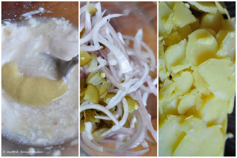 Haşlanan patatesler ılındıktan sonra kabuklarını ayıklayıp, yayvan bir kabın içine ince yuvarlak dilimler halinde kesiyoruz. Hazırladığımız sosu patatesler tam soğumadan katıp üzerini 5 dakika kadar üzerini örtüyoruz ki patatesler sosu iyice emsin. Eğer ılık et suyu katacaksak o da tam bu sırada olmalı. Sonra soğan ve turşuyu, ardından da minik küp şeklinde kestiğimiz elmayı ilave ediyor ve patateslerin ezilmemesine dikkat ederek ilave ediyoruz.
