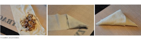 Bir tavada zar şeklinde kesilmiş soğanları pembeleşene kadar kavuruyoruz. Ardından fıstıkları ve kıymayı ilave ediyoruz. Kıyma iyice pişince yıkanmış kuş üzümlerini ve baharatları ekliyoruz ve böreğimizin harcını soğumaya bırakıyoruz. Yufkayı önce ikiye sonra da boyuna şeritler halinde kesiyoruz. Muskaların büyüklüğü yapana kalmış bir şeydir.