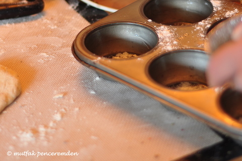 Ardından bunları fotoğrafta da görüldüğü gibi yuvarlıyoruz. Yuvarlarken hamuru hafifçe kaydırarak gül goncası şekli veriyoruz ve hemen daha önceden unlamış olduğumuz muffin kaplarına (tartolet kaplarına da olabilir) yerleştiriyoruz.