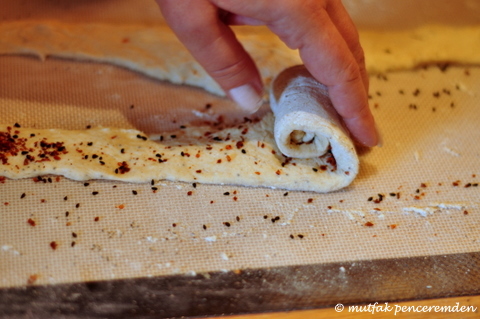 Fırınımızı 180 dereceye ısıtıyoruz. Sonra hamurlarımızı sırayla elimiz yardımıyla ara sıra yine un ekleyerek yarım parmak kalınlığına gelene kadar inceltiyoruz. Bkz. Fotoğraf. Hamurdan yaklaşık 2 parmak genişliğinde ve 1 karış uzunluğunda parçalar kesiyoruz. Şeritlerin üzerine isterseniz toz haşhaş, isterseniz kırmızı pul biber, isterseniz de çörekotu veya anason serpiyoruz.