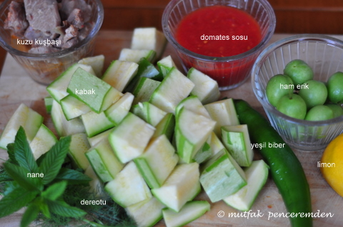 Orta boy bir çelik tencereye kabakları, sonra pişmiş etimizi, ardından domates sosu, limon suyu ve tuz ve pişen etin suyunu da ekleyerek orta ateşte pişmeye bırakıyoruz. 10 Dakika kadar sonra erikleri ve ince kıyılmış dereotu ve naneyi ekliyoruz. Kabaklar piştiğinde, yani en fazla bir on dakika daha sonra yemeğimiz servise hazırdır.