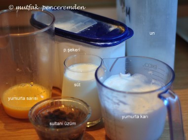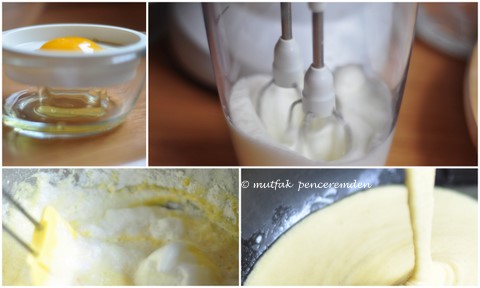 -Sonra yumurta sarılarını sütle çırpıyoruz ve unumuzu ve toz şekeri yavaş yavaş katıyoruz.