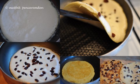 -Tavamızı bir kağıt havluyla temizleyip yeniden yağlıyoruz ve kekimizi tabaktan tavaya aktarıyoruz. Şimdi kızarmış olan taraf üstte kaldı. Üzerine koyduğumuz malzemeyi, yani üzümleri yakmayacak kadar kısık ateşte 2-3 dakika daha pişirdikten sonra büyükçe bir servis tabağına alıyoruz.