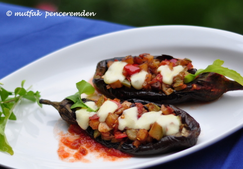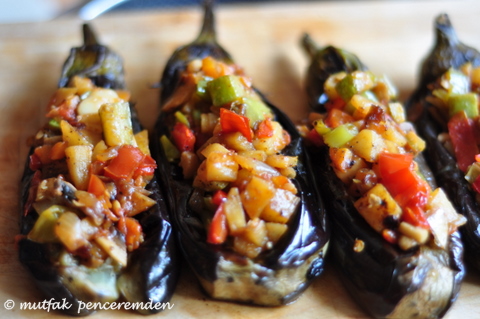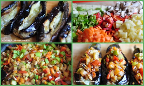 -Tuz ve karabiberle tatlandırdığımız sebzelerimizi patlıcanlarımızın yarıklarına bolca dolduruyoruz.