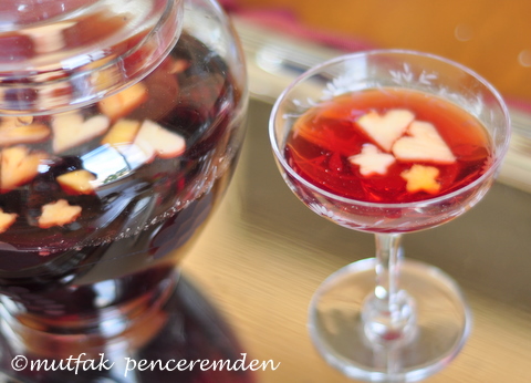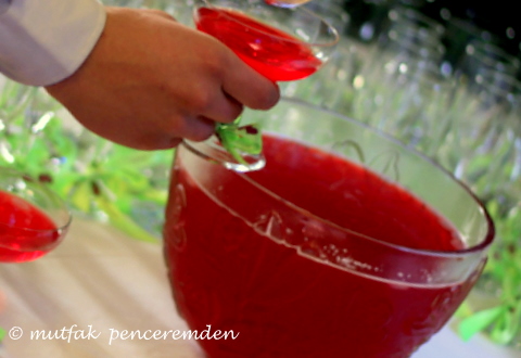 Soda hariç bütün malzemeyi karıştırıp mümkünse buzdolabında bekletiyoruz. Servise yakın sodayı, meyve parçalarını ve buzları ekliyoruz.