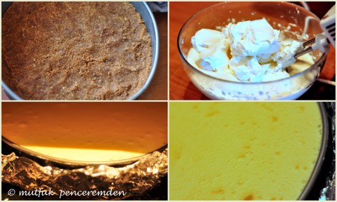 -Bisküvi karışımını kelepçeli kalıbımızın dibine yayıyor ve 150º ye ısıtılmış fırında 15 dakika kadar pişiriyoruz. Soğumaya bırakıyoruz.