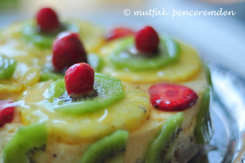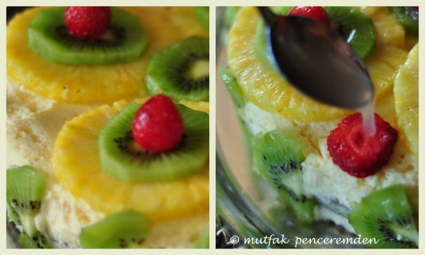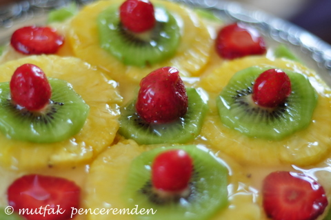 – Buzdolabında en az 6 saat beklettikten sonra üzerini meyvelerle süslüyoruz. Yarım paket tart jölesini fırça ile meyvelerin üzerine sürerek sabitliyoruz. Mümkünse bu işlemden sonra da 2 saat kadar buzdolabında bekletip servis yapıyoruz. Bekleme süresi fazla olan ancak yapıldıktan sonra buzdolabında 2 gün rahatlıkla bekleyebilen bu pastayı seveceğinizi umuyorum.
