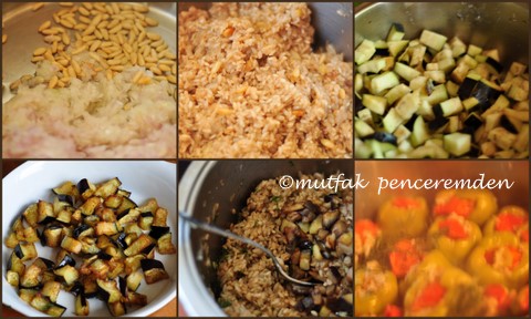 -Tencereye bir miktar ayçiçek veya riviera tipi zeytinyağı koyuyoruz. Dolma fıstığı ve soğanları ekleyip pembeleşene kadar kavuruyoruz. Sağlık açısından kavurmak istemiyorsak 5 dakika kadar kavurup sonra kapak kapatarak soğanları pişirmek de mümkündür. Ardından yıkanmış süzülmüş pirincimizi de katıp 5 dakika da pirinçle kavurduktan sonra limon suyu ve baharatları ekliyor,1 çay bardağı su ilavesiyle dolma içini pirinçler diri kalacak şekilde yarım pişiriyoruz. Tencereyi ocaktan aldıktan sonra içine dereotunu ve patlıcanları da karıştırıyoruz ve ılınmaya bırakıyoruz.
