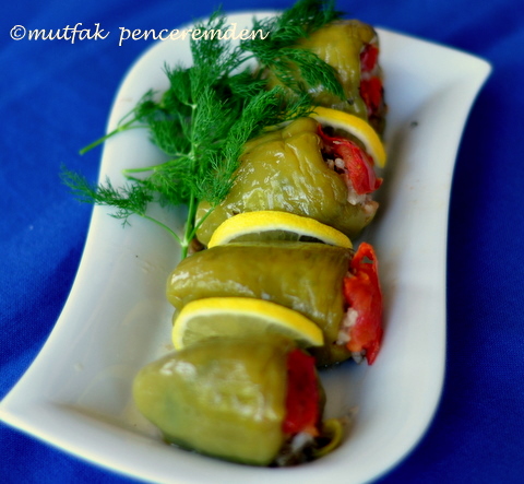 Saymaya kalkarsam dolma çeşitlerini sonu gelmeyecek, iyisi mi bugünkü sürprizli dolmadan söz edelim. Bildiğimiz zeytinyağlı biber dolmasından azıcık farklı bu dolma. İçinde kızartılmış minik patlıcanlar var, diğer dolmalarda olduğu gibi kuş üzümü, bir de maydanoz yok. Ama canınız isterse siz bunları da koyabilirsiniz.