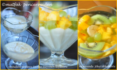 Ayıklanmış ve ufalanmış meyveleri soğuyup donmuş olan muhallebilerin üzerine yerleştiriyoruz ve hemen ardından paketin üzerindeki tarife göre hazırlanan jöleyi kaplara paylaştırıyoruz. Bu arada meyveler jölenin içinde yukarı doğru çıkacaklar ve böylece hoş bir görüntü oluşacaktır.