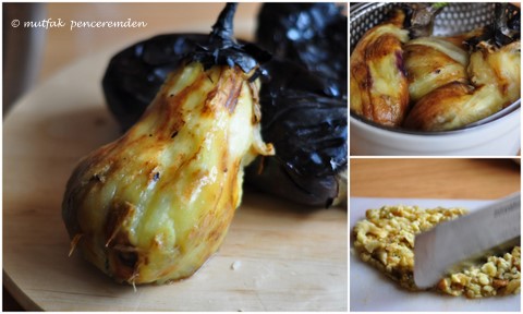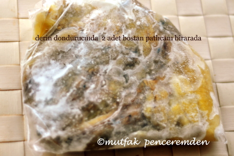 1-Közlenmiş ve itina ile ayıklanmış patlıcanlar çelik veya plastik bir süzgeçte iyice sularını salana kadar bekletirim. Ardından kilitli poşetlere yassı bir şekilde(bütün veya satırla kıyılmış olarak) yerleştiririm. Ben tuz, yağ vs . hiç bir şey katmadan donduruyorum ki çıkarttığımda istediğim şekilde değerlendirebileyim. İstersem beğendi, istersem meze, istersem patlıcanlı poğaça yapayım.