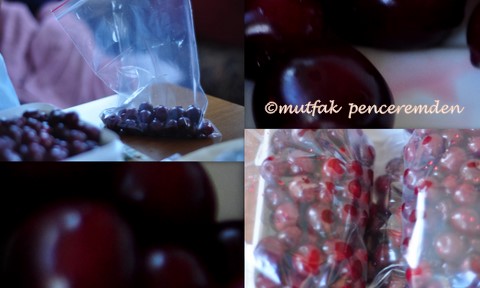 1-İyice kuruduktan sonra çekirdeklerini ayıklamadan kilitli naylon poşetlere yaklaşık 2 avuç kadar bölüştürdükten sonra torbanın ağzını sıkıca kapatıyoruz. İçinde mümkün olduğu kadar hava kalmamasına dikkat ediyoruz. Bu vişneleri pasta veya kek yaparken önce çözüp, çekirdeklerini ayıkladıktan sonra kullanıyoruz. Arzu edersek komposto yapıyoruz, o zaman çekirdekleri çıkartmaya gerek olmayabilir.