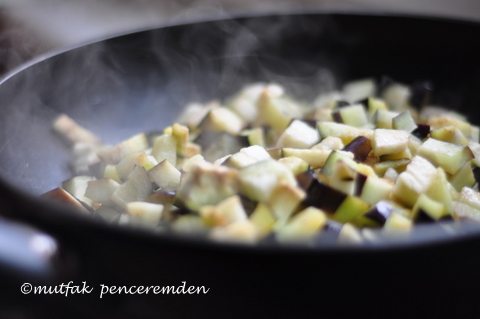 3- Minicik küpler halinde kırmızı ve yeşilbiber eşliğinde kızartılmış veya ızgarada kavrulmuş patlıcanlar. Bunları da yine çözmeyi düşündüğüm kadarını bir torbaya koyarak ağızlarını sıkıca kapatıp donduruyorum. Çözdürüp de üzerine yine yazdan hazırlanmış domates biber sosunu ısıtıp döktüm mü alın size şipşak bir meze.