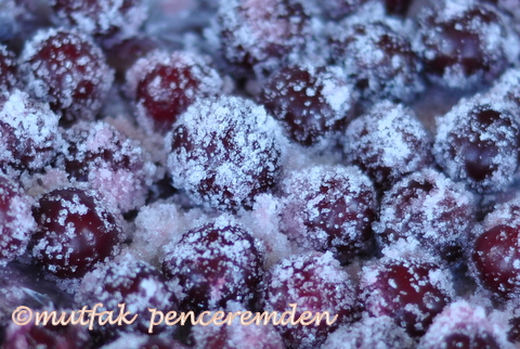 2- Henüz üzerleri kurumamış vişneleri içinde toz şeker olan yayvan bir kabın içinde şekerliyoruz. Bkz. Fotoğraf. Ardından buzlukta bekleteceğimiz kabın içine her katın arasında naylon olacak şekilde yerleştiriyoruz. Böylece, dondurduğumuz vişnelerin sadece istediğimiz kadarını diğerlerini gevşetmeden alabileceğiz. Donmuş vişne şekerlemelerini aniden gelen konuklarımıza buzluktan çıkar çıkmaz henüz erimeden likör ve çikolata yanında ikram edebiliriz. Veya insanın birden canı tatlı ister de bir şey bulamaz, bir kase yoğurt ve bir iki kaşık donmuş şekerli vişne bu arzumuzu bastırmaya birebirdir.