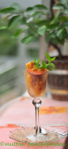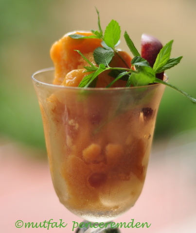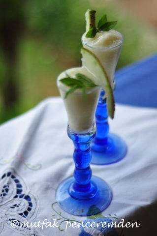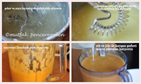 1 bardak su, 1/2bardak sütü 1/2bardak şeker ve bir paket Dr. Oetker tart jölesini iyice karıştırıp kaynatıyorum. (Tart jölesi yerine aktarlarda satılan toz jelatini ılık suda erittikten sonra kullanabilirsiniz)Akıcı bir muhallebi kıvamına gelince soğumaya bırakıyorum Diğer yanda 2 bardak meyve püresi hazırlıyorum. Karışımım soğuduktan sonra meyve püresi ile iyice karıştırıp ve buzlukta donmaya bırakıyorum. Daha önce söylediğim gibi ilk 2 saat, yarım saatte bir dışarı alıp karıştırıyorum.
