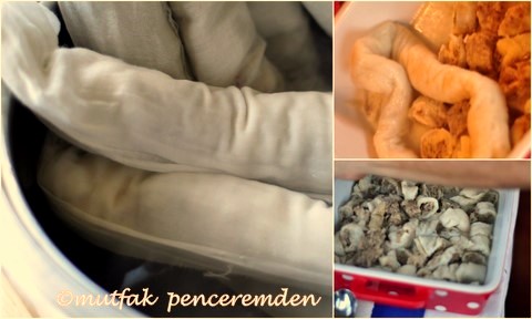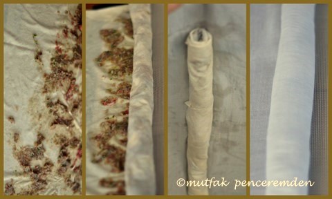 – Her kıymalı yufka rulosunu bir tülbentin üzerine koyup onları da tek tek ve sıkıca sarıyoruz.