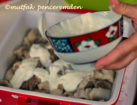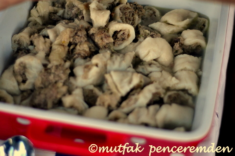 – Isınan kabın içine tencereden aldığımız mantıları tülbentlerinden ayırarak yerleştiriyoruz. Büyük bir bıçakla dilim dilim kesip üzerlerine hemen yoğurdumuzu ve biberli tereyağımızı gezdirdikten sonra sofraya getiriyoruz.