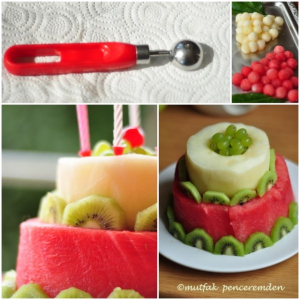 -Karpuz ve kavunun içinden keseceğiniz minik toplarla değişik şekiller yapabilirsiniz. Mesela fotoğrafta olduğu gibi, bir tepsiye veya büyük bir tabağa iki üzüm salkımı yapabilir, yemekten sonra sofraya getirdiğinizde konuklarınızı şaşırtabilirsiniz.
