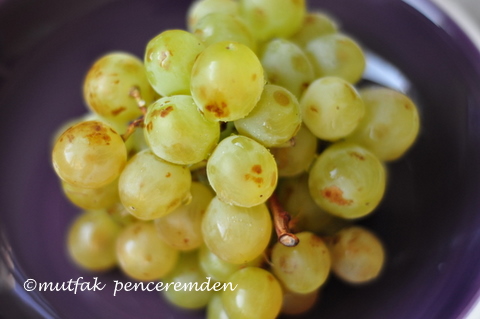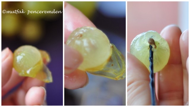 -Üzümlerin iyice yıkadıktan sonra parçalmamaya dikkat ederek kabuklarını ayıklıyoruz. Aslında zor gibi görünse de kabuklar çok ince ve kolayca üzümün etinden ayrılıveriyorlar.
