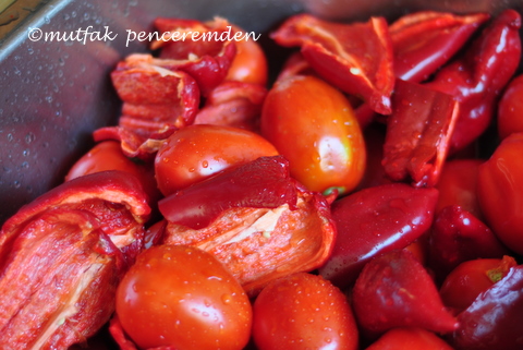 -Ezik olmayan mümkünse bol etli domatesleri ve içine katacağım kırmızı ve yeşilbiberleri iyice yıkadıktan sonra, biberlerin tohumlarını ayıklıyorum. Domateslerin de saplarını çıkartıyorum.