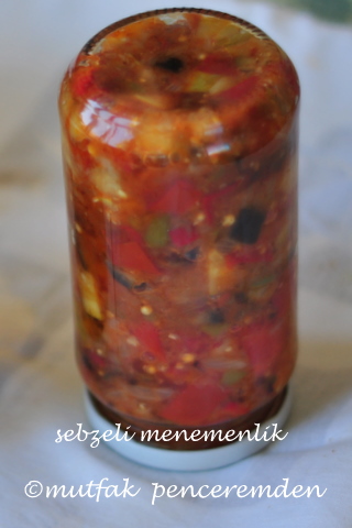 Ben domatesi sade püre olarak sakladığım gibi yemeklik olarak soğanlı, biberli püre şeklinde ve de menemenlik olarak da kavanozlara dolduruyorum. Hatta sebzeli menemenlik de yapıyorum.