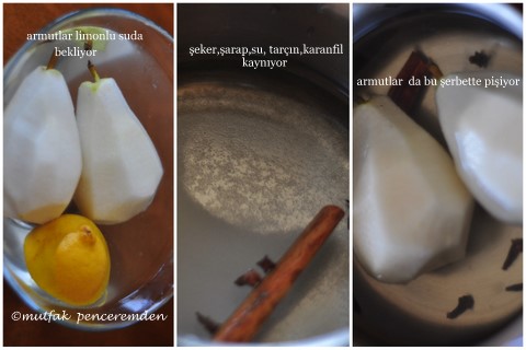 8 adet armut (Santa Maria veya yumuşak olmayan üzerinde sapı olan ve biribirine yakın orta büyüklükteki her armut olabilir, mühim olan pişerken dağılmamasıdır.