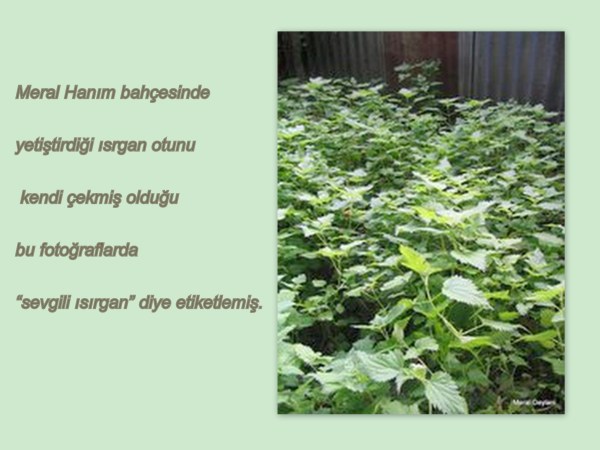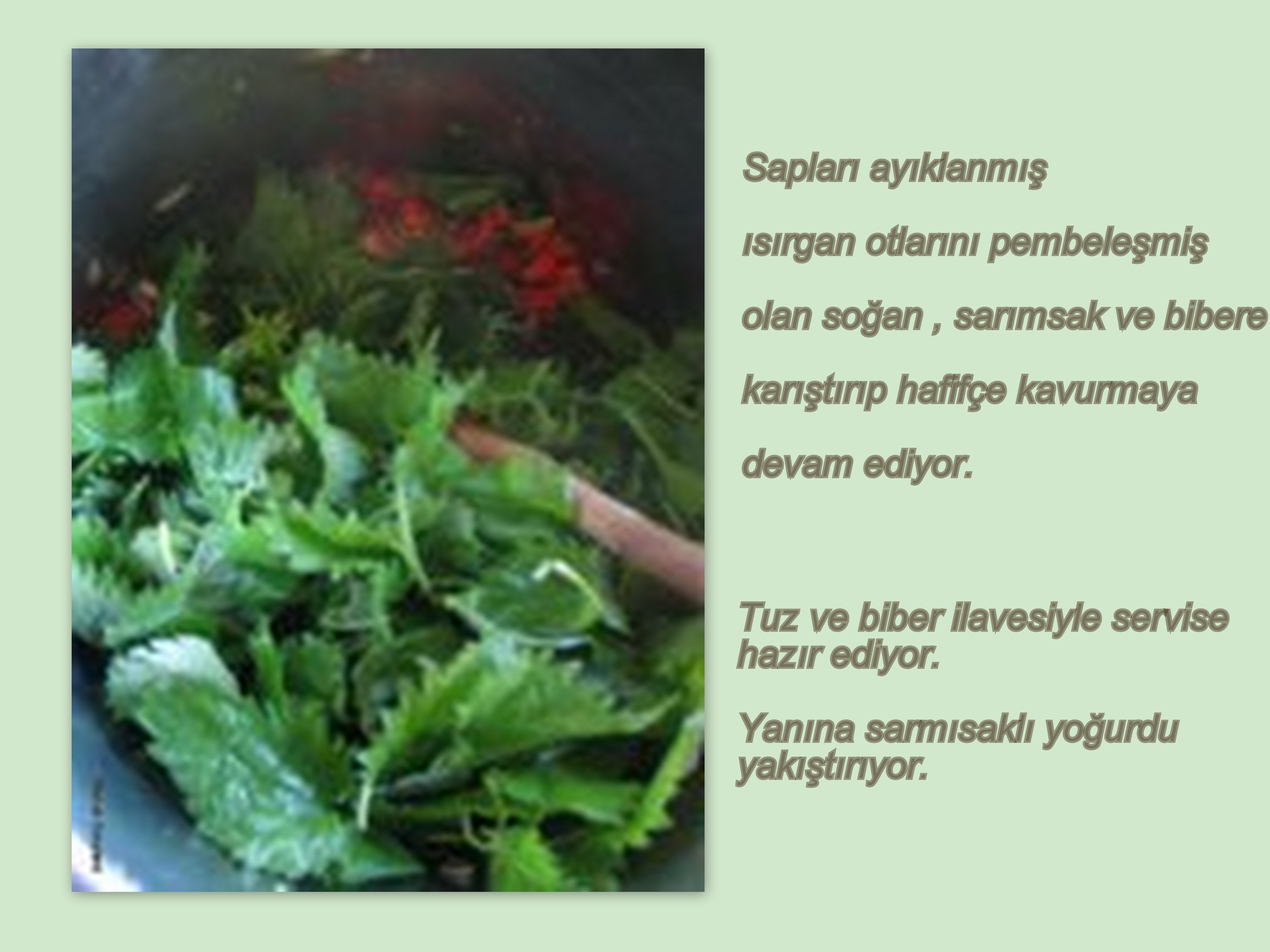 Bugünkü yazımızda yer alan resimlerden sadece yemeğin servis tabağına alınmış olanı bana aittir. Bu da yemeği yaptığımın bir göstergesi olsun diye:))Isırgan saplarını da özellikle kullandığımı hatırlatmak isterim.