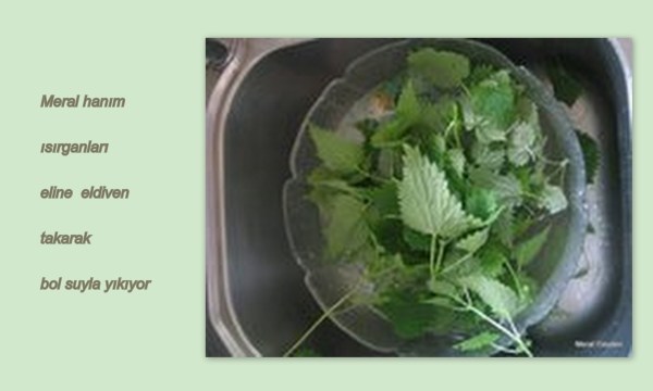 Nazilli’den gelecek kolime hemen ısırgan otunu da ekleyerek işe başladım. Aynen Meral Hanım’ın dediği gibi elime eldiven takarak ısırganları yıkadım. Yemeğimi pişirirken, birden ıspanak pişiriyormuşum gibi düşündüm ve içine 2 yemek kaşığı da pirinç ekledim. İyi de yapmışım, çünkü yanına sarımsaklı yoğurt koyarak ana yemek olarak yedik. Belki pirinç olmasaydı o zaman yemek yanı olacaktı.