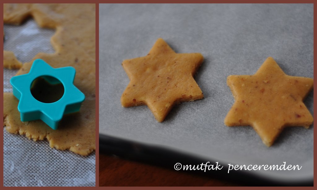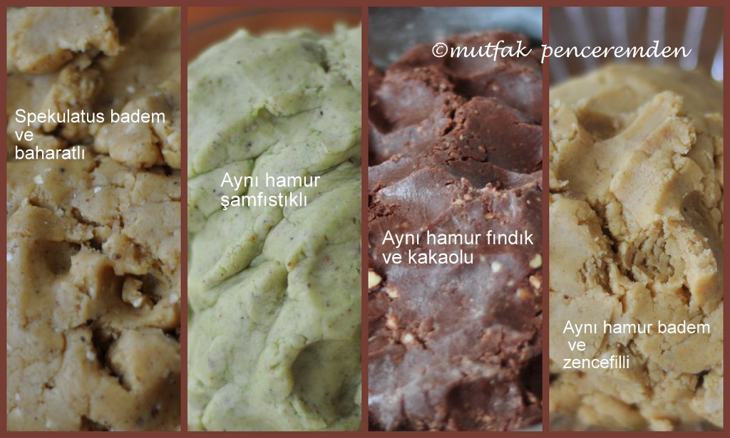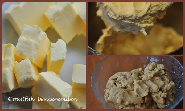 Buzdolabından çıkan tereyağımızı bıçakla ufak parçalara bölüyoruz. Un ve tereyağını iyice karıştırdıktan sonra şekeri, baharatları, badem tozunu ve yumurtayı ekleyip kulak memesinden biraz daha sertçe bir hamur elde ediyoruz. Yarım saat kadar dinlendirilen hamurumuz artık çalışmaya hazırdır. Hamurumuz bu haliyle buz dolabında 2-3 gün derin dondurucuda 2-3 ay kadar saklanabilir.