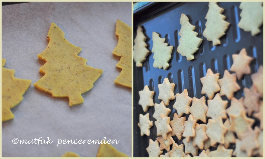 Herkesin kendine gör kurabiye yapma teknikleri olabilir. Ben fotoğraflarda görüldüğü gibi kurabiye hamurumu iki naylon tabaka veya yağlı kağıt arasında açmayı tercih ediyorum. Böylece ne tezgaha ne de merdaneye yapışmıyorlar. En fazla ½ cm. kalınlığında açtığımız hamurdan şekiller kesip önceden 180 dereceye ısıttığımız fırında sadece 10-15 dakika kadar kurabiyeler fazla kararmayacak şekilde pişiriyoruz. Fırını söndürdükten sonra tepsileri 5 dakika daha fırında bekletip sonra dışarı alıyoruz. Kurabiyeler soğudukça sertleşecekler. Ancak iyice soğuyunca süsleme yapmak istiyorsak süsleme yapıyor ve teneke kutularda saklıyoruz.
