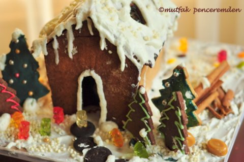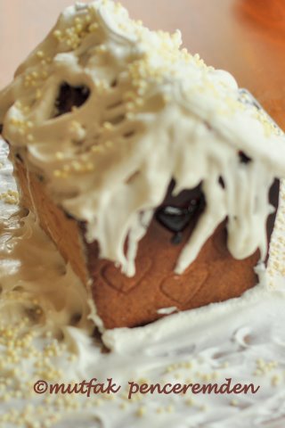 -Daha sonra hayal gücümüzü de ekleyerek royal icing kremasıyla damı ve evi süslemeye başlıyoruz. Evin tabanına da ya şeker hamuru ya da bolca pudra şekeriyle kar yağdırıyoruz.