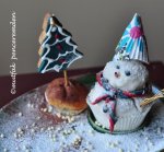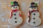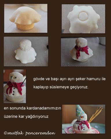 Daha sonra istersek keklerin üzerine royal icing kremasını( yılbaşı kurabiyesi 1 de verdiğim gibi)bir fırça ile sürüp biraz donmasını bekliyoruz, ya da fotoğraftaki gibi beyaz şeker hamuru ile yuvarlaklar keserek kardan adamımızı kaplıyoruz.