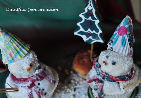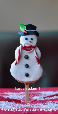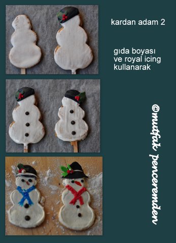 Daha önce de tarifini verdiğim yılbaşı kurabiye tarifini kullanarak hazırladığınız hamurdan kardan adamlar kesip,pişiriyoruz.