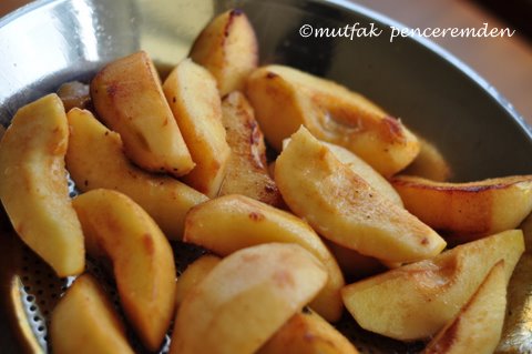 -Ayvaları sudan alıp soğanları sotelediğimiz tavada 3-4 yemek kaşığı sıvı yağ ile alt üst dikkatlice çevirerek iyice pembeleştiriyoruz.(Bu aşamada arzu edenler ayvaları bol yağda patates kızartır gibi kızartabilirler, ama ben bunu pek tercih etmiyorum.)
