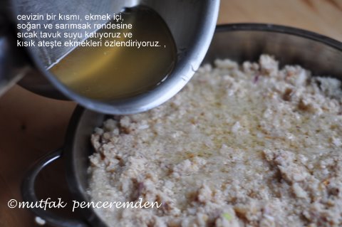 -Soğanı, ekmekleri, cevizin yarısını, yavaş yavaş eklediğimiz sıcak tavuk suyu ile özlendiriyoruz.