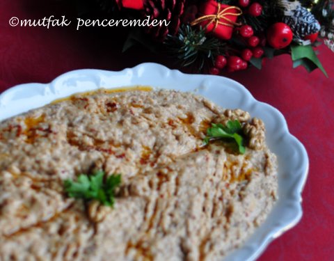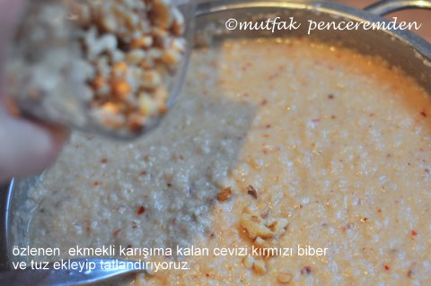 -Sarımsakları tuzla dövüyoruz, özlenen ekmeklere ekliyoruz. Cevizin kalanını da ekledikten sonra kırmızıbiberle tatlandırıyoruz. Ben hem biberin acısını hem de sarımsağın lezzetini iyice hissetmek isterim bu yüzden tatlandırırken ölçüye sadık kalmak yerine tadına bakmayı yeğlerim.