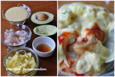 -İçine minik doğranmış mantarları, yine minik kesilmiş ananası, dereotunu ve bütün olarak karidesleri koyup karıştırıyoruz. Bazıları birazcık çok ince kıyım salata yaprağı eklerler, eğer siz de böyle bir şey yapmak isterseniz bu yeşilliği tabağın dibine yerleştirip kokteyli üzerine koymalısınız .